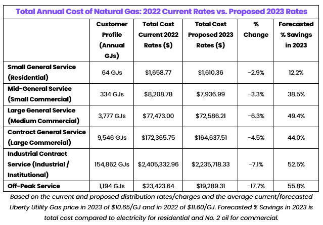 Liberty is proposing to lower the distribution rates for all commercial customers, which would mean decreases of 3.3% to 17.7% (depending on rate class) in their total cost of natural gas in 2023 as compared to 2022. This takes into account the lower forecast of the cost of commodity in 2023 of $10.65/GJ. Commercial customers can expect to see savings of 39% to 56% (depending on rate class) compared to No. 2 oil and even more if the cost of natural gas supply is lower than forecasted.